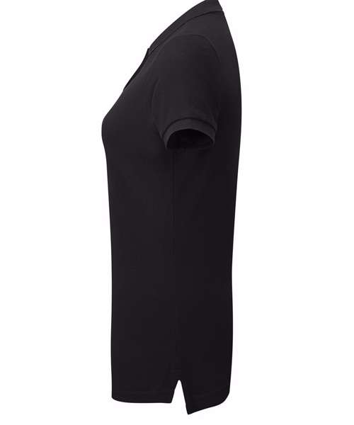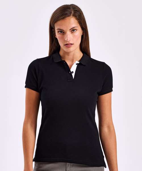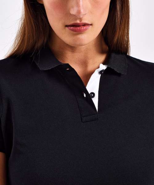 Fitted polo for women with contrast collar and placket. Two contrast coloured buttons on placket. Contrast colour on side vents. Twin needle stitching on hem. Ribbed knit collar and sleeve cuffs.