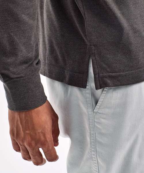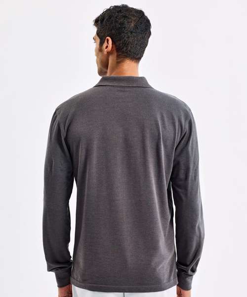 Long sleeved polo shirt styled for men. Knitted cuff and collar detail. Two button placket. Side vents. Machine washable.