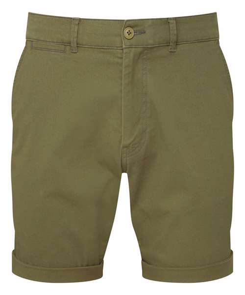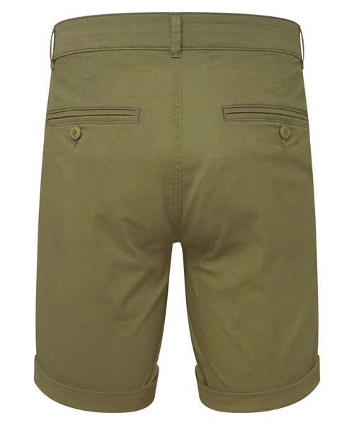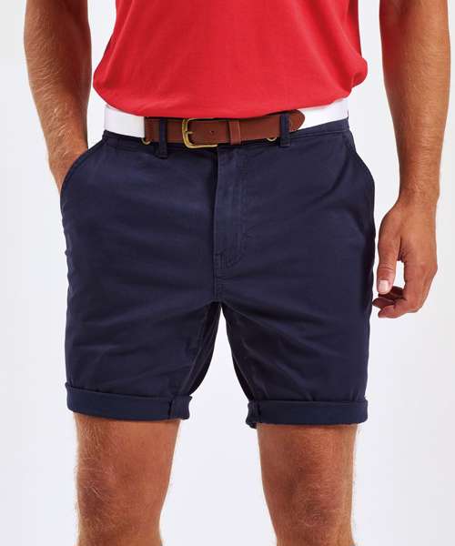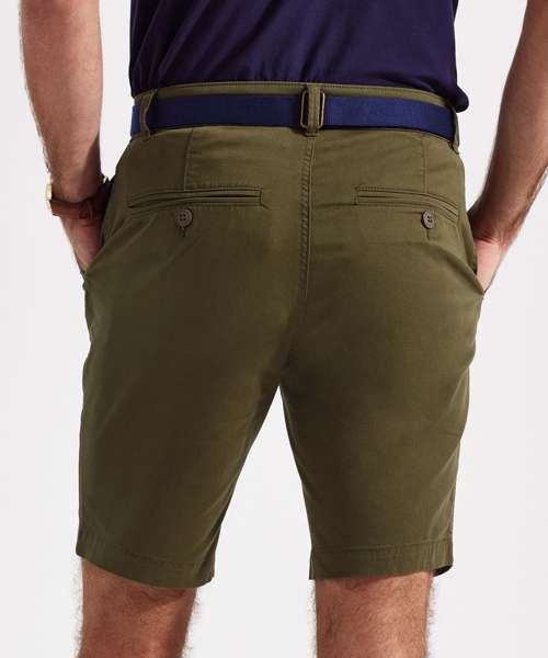 Men’s chino shorts with two swing pockets and two back jet pockets. Zip fly and button fastening to the front. Soft-finish lightweight fabric. Belt loops. Style can be worn rolled up.