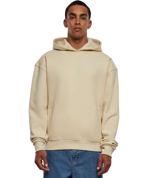 The men's hoodie features a large hood and wide rib cuffs on the sleeves and hem. The integrated kangaroo pockets add a practical touch. A casual urban fit with dropped shoulders creates a masculine silhouette. The men's hoody is made of smooth and heavy brushed fleece, which can be further refined using flex or screen printing.