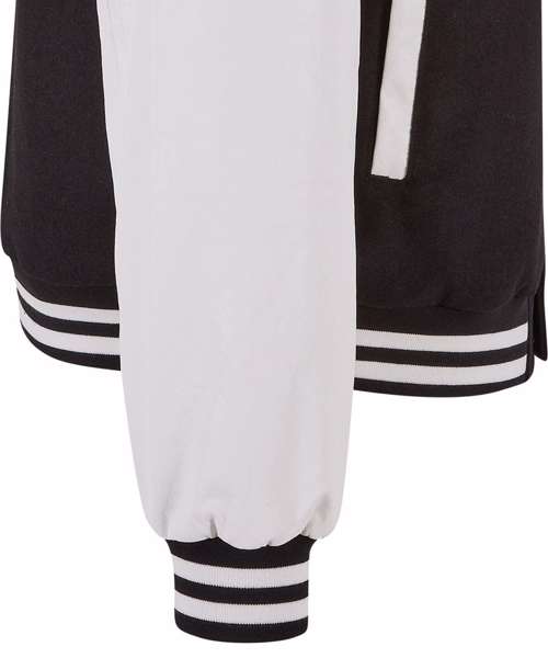 Equipped with contrasting sleeves, this men’s college jacket exudes retro vibes. Classic details such as a snap button placket, striped stand-up collar, hem and cuffs complete the look. Its design is rounded off by colour-accentuated side pockets and rib cuffs. The fabric consist of wool and viscose to ensure comfort in this regular cut. The jacket can further be refined via embroidery.