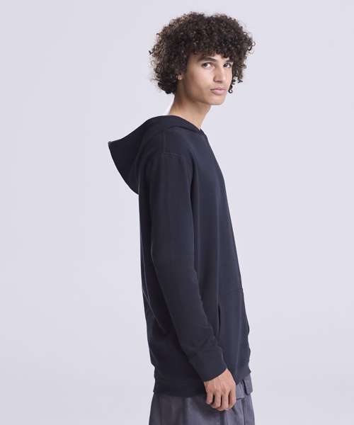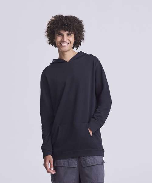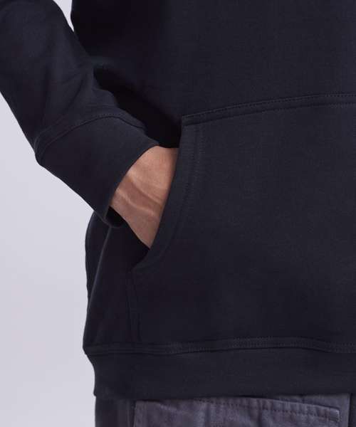 100% Organic hoody, with brushed inner and peached face. Kangaroo pocket, angled cuff detail and no drawcords for sleek look.