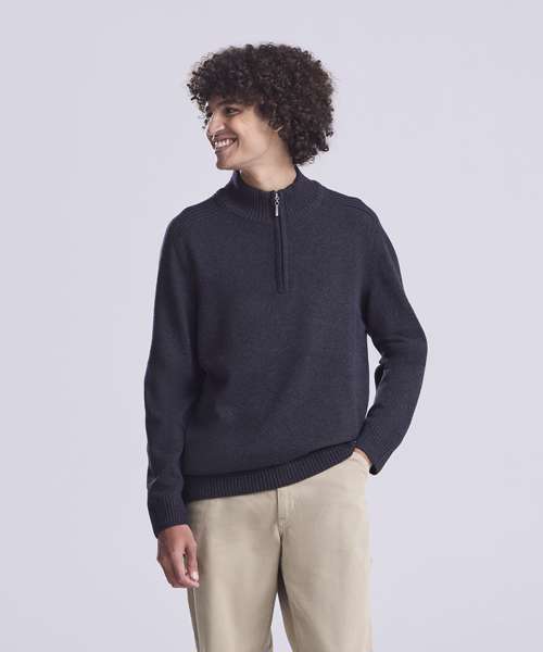 Long sleeve sweater made from regenerated cotton with tall collar and ¼ zip neck. Contrast rib stitches at shoulders cuff and hem.