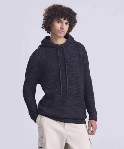 Chunky tuck stitch knitted hoodie made from regenerated yarn. Featured hood with drawcords, rib at cuffs and hem and two-tone yarn.