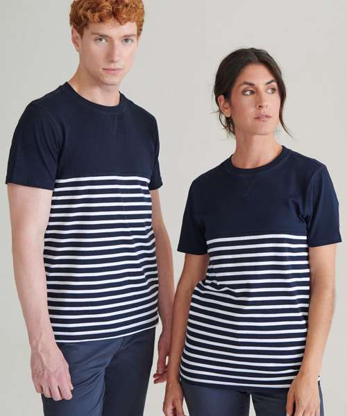 Tag free regular fit, heavyweight short sleeved t-shirt. Crew neck with stretch ribbed neckline. Twin-needle stitching at cuffs and hem. 'V' flatlock stitching detail at neck. Flatlock stitching at neck, shoulder seam and armholes. High chest seam. Striped lower body; contrast plain upper body and sleeves. Coordinates with FR134 long sleeved Breton T.