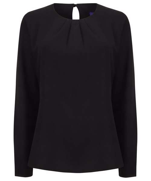 Pleat front blouse. Single button back neck opening. Set-in long sleeve. Slightly gathered sleeve at cuff with keyhole opening and button fastening. Slightly curved hem. Fabric contains easy care, wicking, anti UV, quick-drying properties.