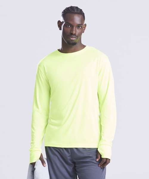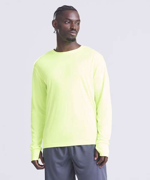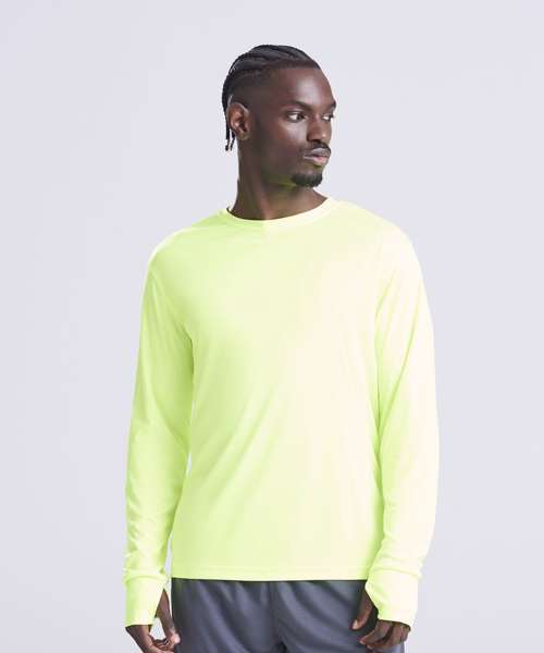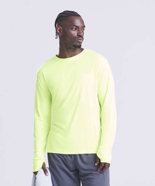 Relaxed sports fit. Thumbholes. Back waist zipped pocket. AWDis’ own lightweight Neoteric™ smooth fabric with inherent wickability and quick-drying properties. Self-fabric taped back neck. Twin-needle stitching detail. Self-fabric crew neck. Reflective tab detail. Set-in long sleeve design.