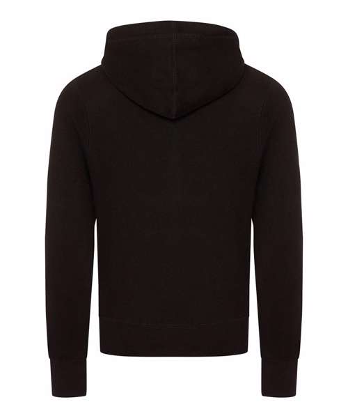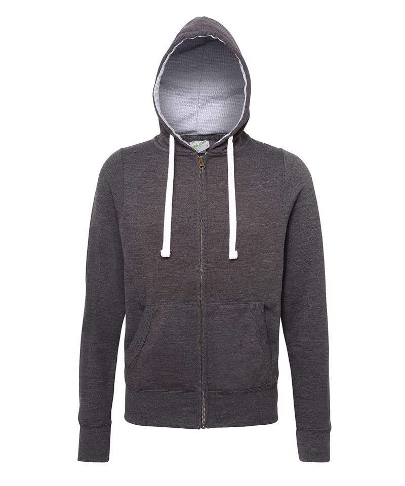 Full zip hoodie. Side panels for stylish fit. Brass zip covered with chunky rib detail. Overlock stitching detail throughout. Double fabric hood with heather grey waffle fabric inner. Chunky white flat lace drawcord. Kangaroo pouch pocket. Deep ribbed cuff and hem. Soft cotton faced fabric creates ideal printing surface.
