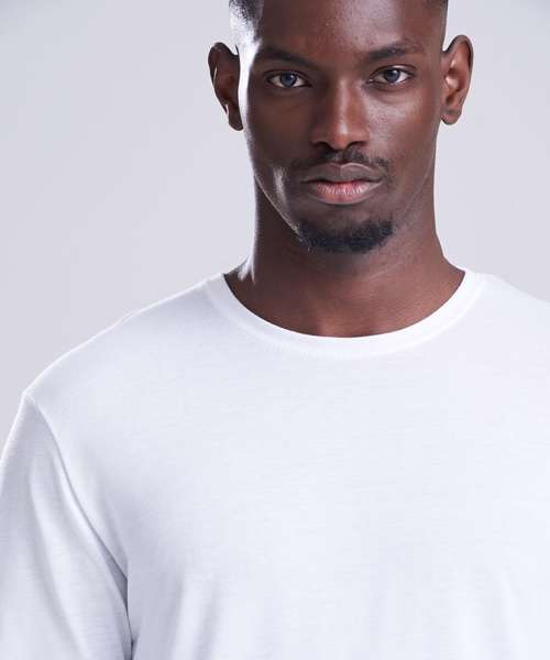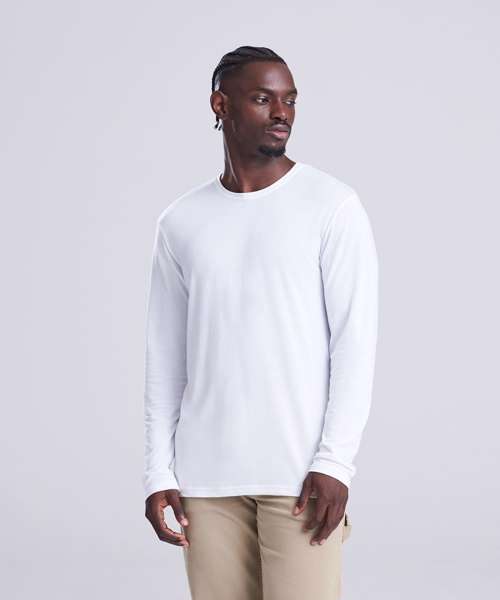 Modern fit long sleeved T. Size tab label. Triblend fabric for style and comfort. Taped neck. Twin-needle stitching on sleeves and bottom hem. Ribbed crew neck style. soft-feel fabric. Side seams. Set-in sleeves.