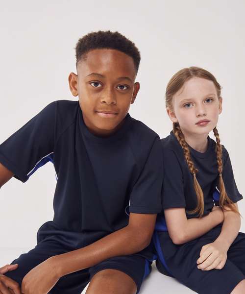 Kids crew neck t-shirt with raglan sleeves. 100% Polyester wicking fabric. Contrast side panels with piping.