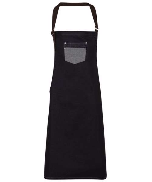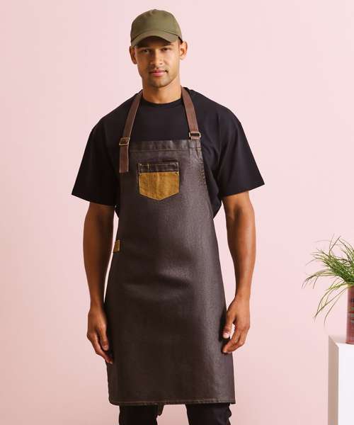 A bib apron with rustic charm for those who want a more vintage approach to their service uniforms. Decorated with contrast fabric features for design and functionality. The faux leather detail really elevates this apron to give it an authentic, luxurious appearance, popular with many establishments.