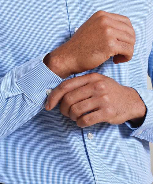 Long sleeve fitted shirt with soft collar styling. Double buttoned cuffs. Gingham pattern. Back yoke.