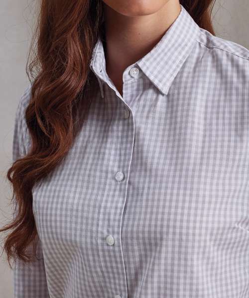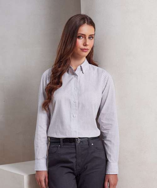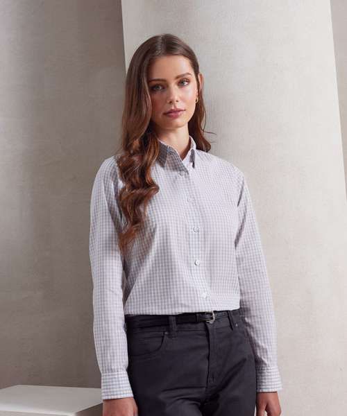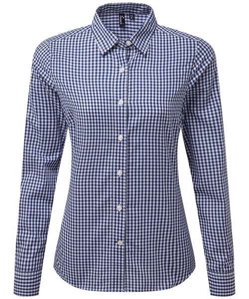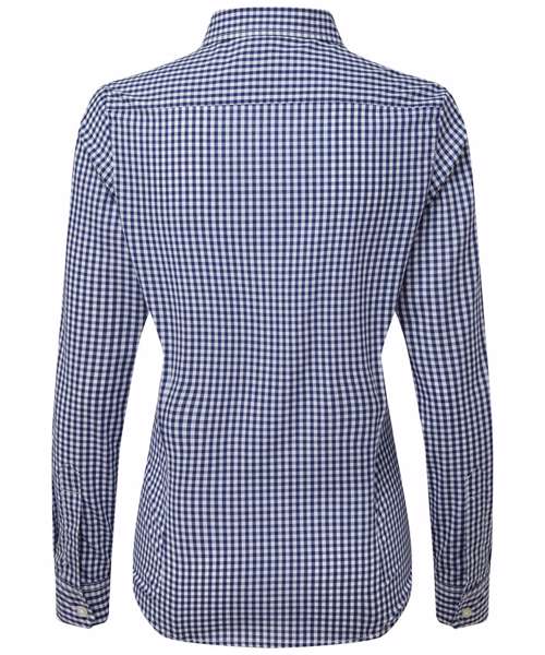 An attractive long sleeve gingham patterned shirt in strong contrast colours. Featuring a single buttoned cuff and sleeve guard. Styled with a narrow soft collar with button down options on the underside. An easycare and durable women's chequered shirt that gives a charming, vintage-chic approach to front-of-house service.