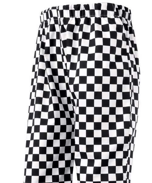 Unisex pull on chef’s trouser. Available in Black or White check or plain Black. Elasticated waist for easy pull on trouser. Unisex sizing. 30.5" inside leg. Side swing pockets. Drawcord.