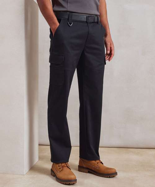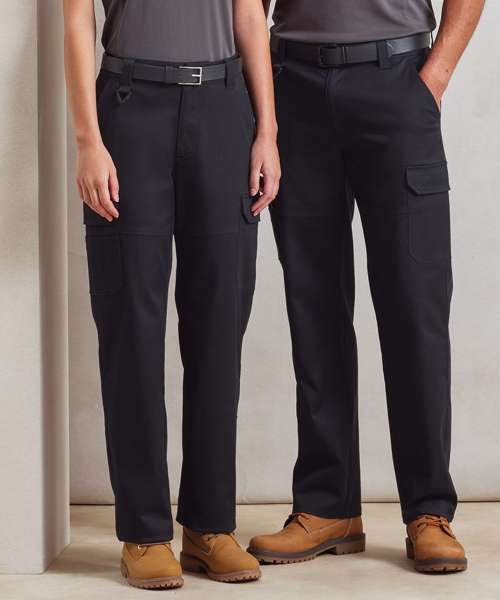 Durable work cargo trousers with Premier's Stretchchecker fabric for stretch and a comfortable fit. Belt loops and two-button fastening to the waistband. Covered YKK zip fly. Side sling pockets. Multiple mobile friendly, cargo-style pockets with hook and loop fastening. Single patch pocket to the reverse. Two leg lengths. Unisex styling. Contains certified recycled polyester.