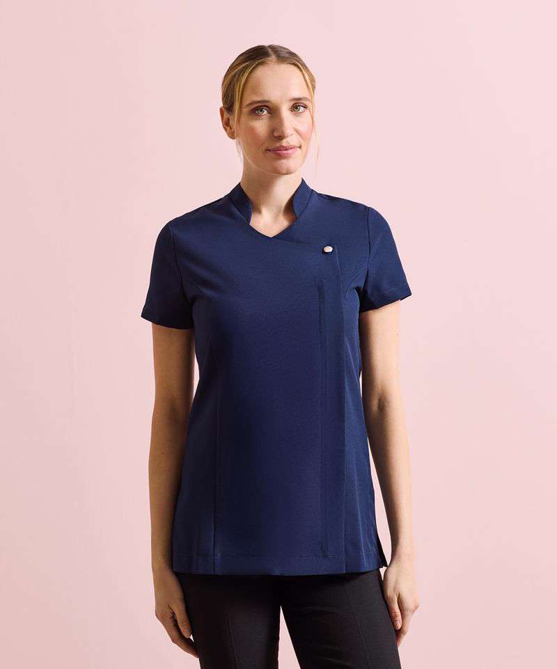 Beauty and spa tunic with feature button front fastening with concealed zip. Mandarin collar. Short sleeve. Princess seams. Side vents. Back pleat for ease of movement. Easycare.