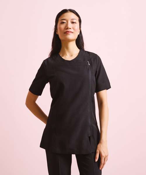 Beauty and spa tunic with cross over neckline and asymmetric zip front. Short sleeve with vented cuff. Side vents. Princess seams with topstitch detail for flattering fit. Easycare.