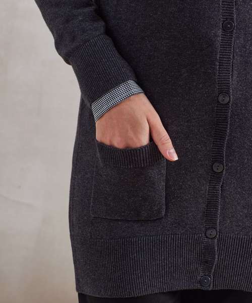 Long length cardigan with cotton rich yarn for a soft feel. Fine gauge knit. Five self-coloured buttons. Two front patch pockets. Ribbed knit v-neck, cuffs and hem.