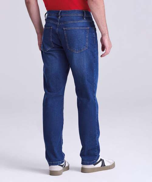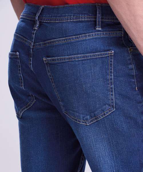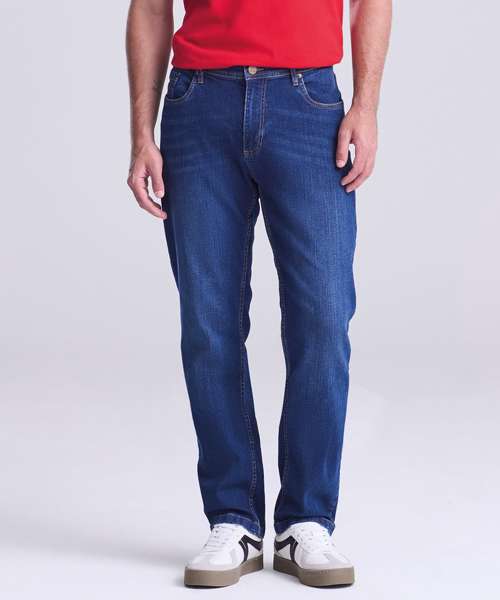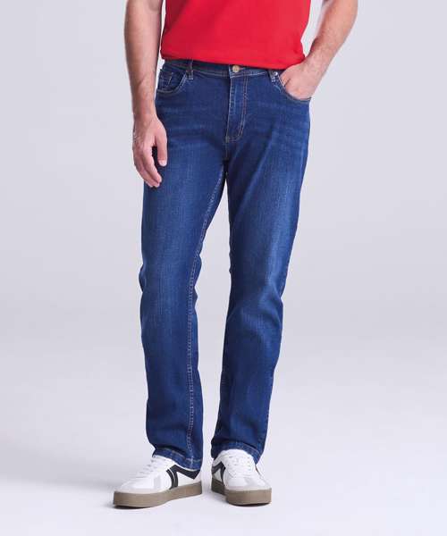 Straight fit, stretch denim, 5 pocket styling, light blasting and whiskering, self-fabric belt loops, shank button and YKK zip fly fastening, metal rivet detail at pocket corners, twin needle stitching detail.