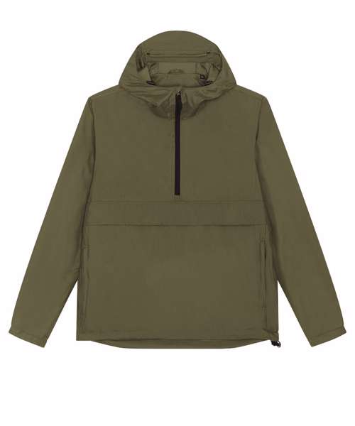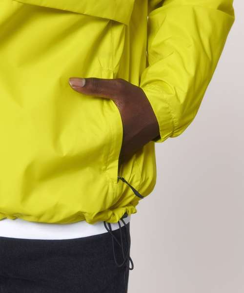 Longer back length with curved hem for protection. Bottom hem and hood with adjustable plastic stopper and elastic cord. Sealed hood visor. Zipped welt pockets. Non-functional flap, front and back. Self-fabric half-moon at back neck. Inside zip opening at bottom hem and inside loop, with snap at armhole providing easy access for chest decoration.