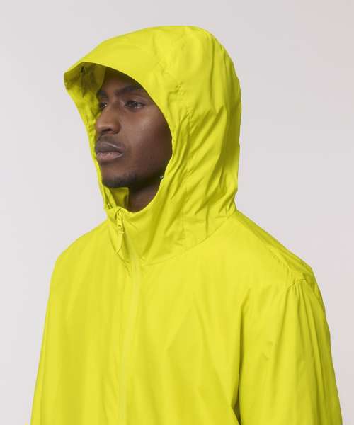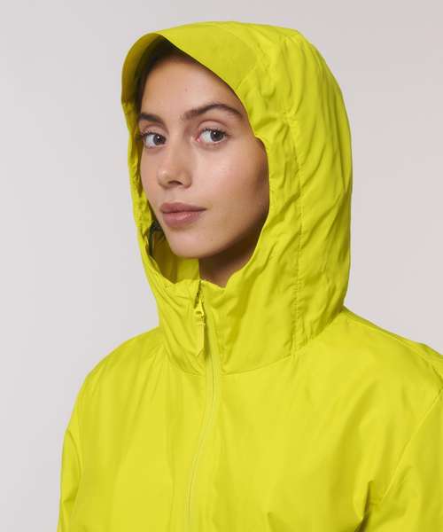 Longer back length with curved hem for protection. Bottom hem and hood with adjustable plastic stopper and elastic cord. Sealed hood visor and sealed welt pockets. Zipped welt pockets with extra grosgrain pull. Self-fabric half-moon at back neck. Inside zip opening at bottom hem and wearer’s left chest for easy decoration.