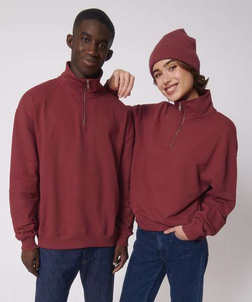 Unisex boxy dry hand feel quarter zip sweatshirt. Set-in sleeve. Neck collar in self-fabric. Herringbone tape at inside back neck and at inside of zip. Quarter zip at centre front. 2x1 rib at sleeve hem and bottom hem. Armhole, sleeve hem and bottom hem with twin-needle topstitch.