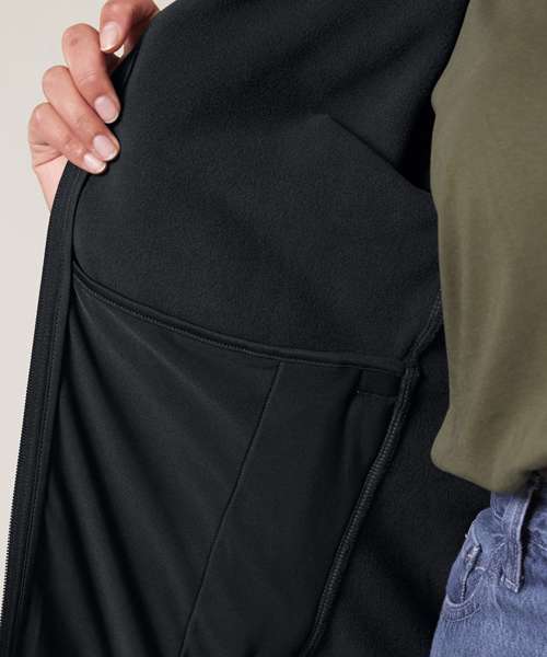 Set-in sleeves. Elastic binding at neck edge, cuffs and hem. Inside back neck grosgrain loop. Nylon coil zip with metal zip pull and cord ending. Brushed fabric with anti-pilling finish on the inside and outside. Front side welt pockets with zip opening. Inside back neck tape in recycled polyester.