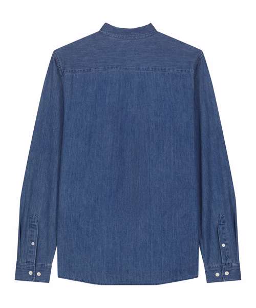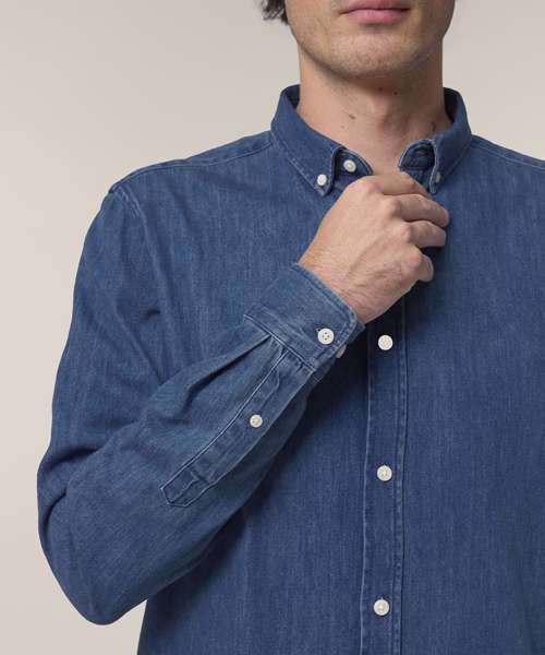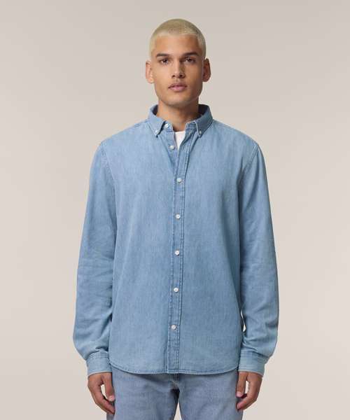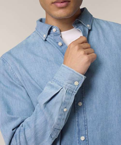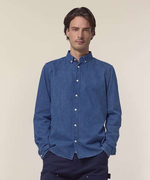 The Stanley denim shirt for men. Medium fit. Button-down collar with single-needle topstitches. Collar stand. Front placket single-needle topstitches on each side. Forwarded shoulder. Back yoke. Inside yoke in self-fabric. Set-in sleeves. Sleeve placket with one button. Cuff with two buttons. Rounded cuff corners. Double pleats at cuff seam. Faded look on all seams due to garment washing – indigo yarn dyed product – so each garment may vary in appearance.