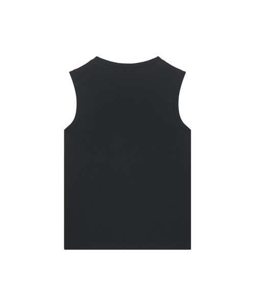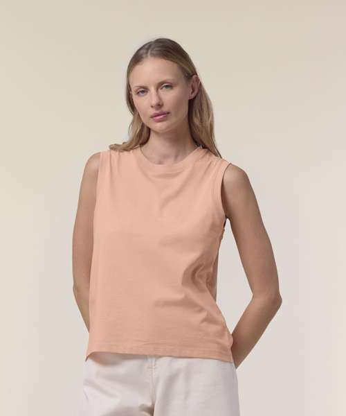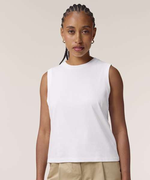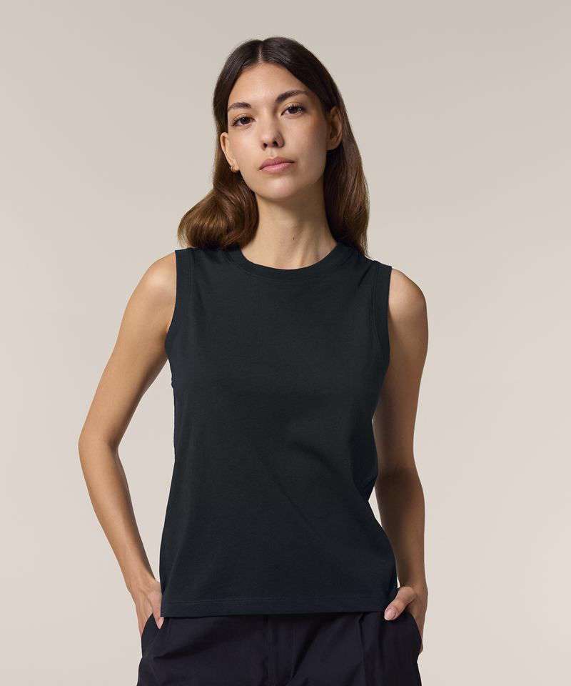The Stella Mia tank top for women. Medium fit. Sleeveless. 1x1 rib at collar and armhole. Back neck tape in self-fabric. Twin-needle topstitches at hem.