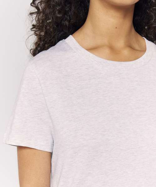 The iconic women’s t-shirt. Modern medium fit. Set-in sleeve. 1x1 rib at neck collar. Inside back neck tape in self-fabric. Narrow twin-needle topstitch at sleeve cuff and hem.