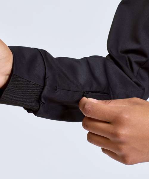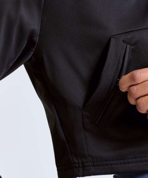 Lightweight cropped pull-over jacket. Kangaroo pocket to front with additional zip detailing for storing items like keys etc. Super-smooth finish to jacket. Cuffs half elasticated for additional detailing and trapping in warmth. Detailing to hood. We recommend using block out vinyl and inks.