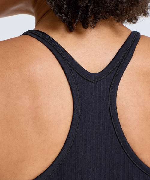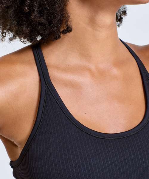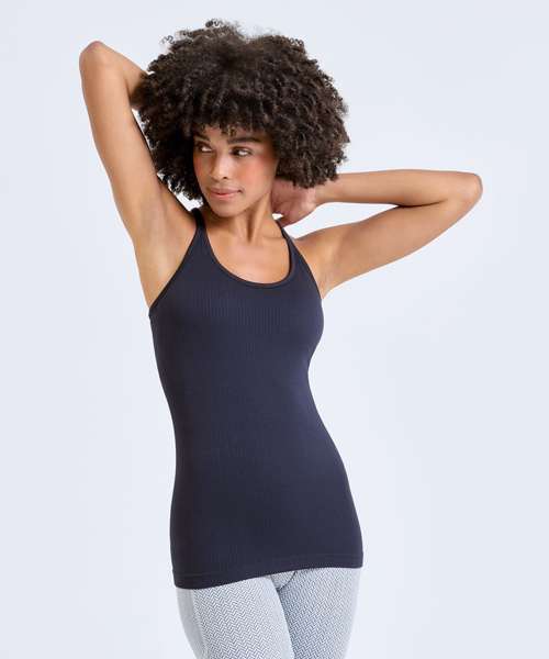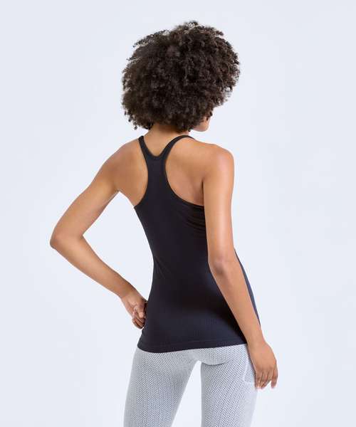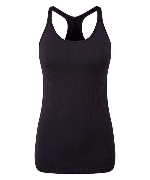 Seamless vest. Contrast detailing. Body sculpting design detailing. Racerback. Hidden sports bra inner with removable bra pads for additional support. Ribbed stretch fabric. Medium impact. We recommend using block out vinyl and inks.