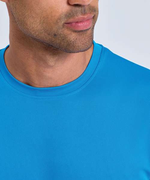 Wicking fabric. Stretch. Crew neck. Short sleeve. Lightweight. Twin-needle stitching on hem and arms. Recycled polyester. We recommend using block out vinyl and inks. UPF 40+.
