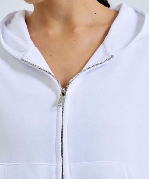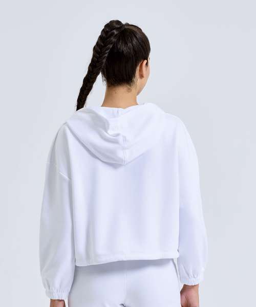Oversized, cropped, zipped hoodie. Zip to centre. Drawstring tie to waist. Kangaroo pockets to front. Contains recycled polyester fabric.