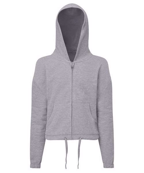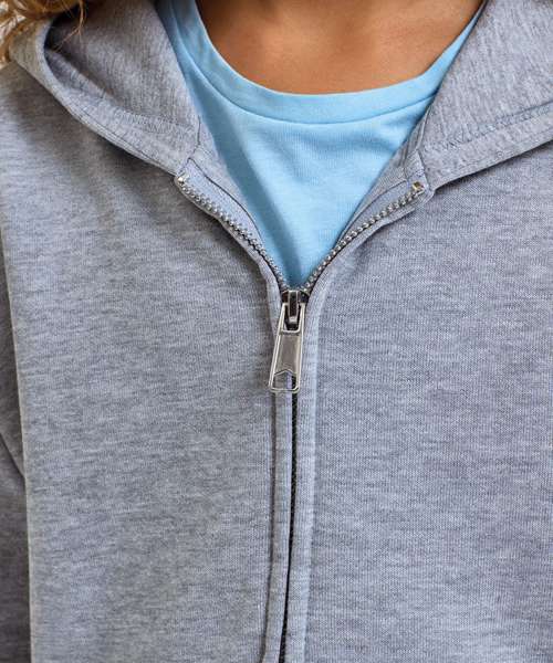 Oversized, cropped hoodie full-zip hoodie. Concealed zip to front in chrome finish. Dropped shoulders. Drawstring tie to waist which is sewn in at the back of the garment. Kangaroo pockets to front. Recycled polyester. We recommend using block out vinyl and inks.