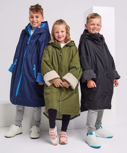 Unisex. Oversized. Full-length two-way plastic zip with easy pull toggles. Chin guard. Oversized fit. Side vents. Adjustable cuffs with hook and loop fastening. Side zip pockets. Inside pocket with zip on the left side. Inside patch pocket on the right side. 3-panelled hood. Loop on the centre back of the jacket for hanging the robe. Dropped back hemline. (5000/5000 waterproof and windproof). Embroidery access to the back and chest area can be accessed through here. Waterproof taped seamed outer layer. Sherpa fleece interior. Rebrandable stuff sack carry bag with double drawstring straps. CE Class 1 Certified.